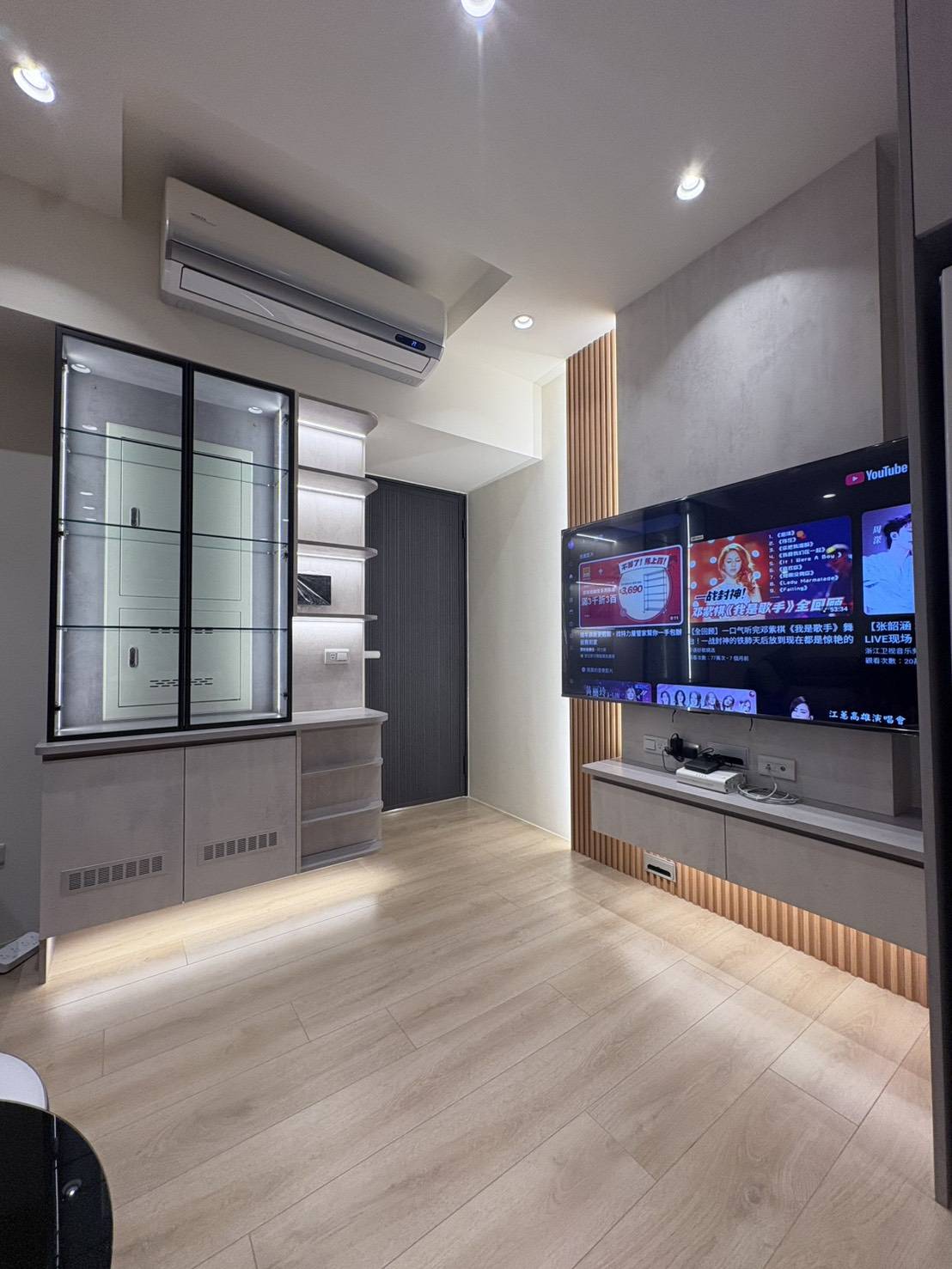 本案以客廳主要視覺牆面為核心,透過系統電視櫃與展示櫃的整合配置,讓收納與展示功能同時存在而不顯雜亂,櫃體配置依照實際觀看距離與使用習慣進行安排,使電視區域成為空間的視覺重心,同時保留足夠的收納容量,讓日常物品能夠妥善歸位。