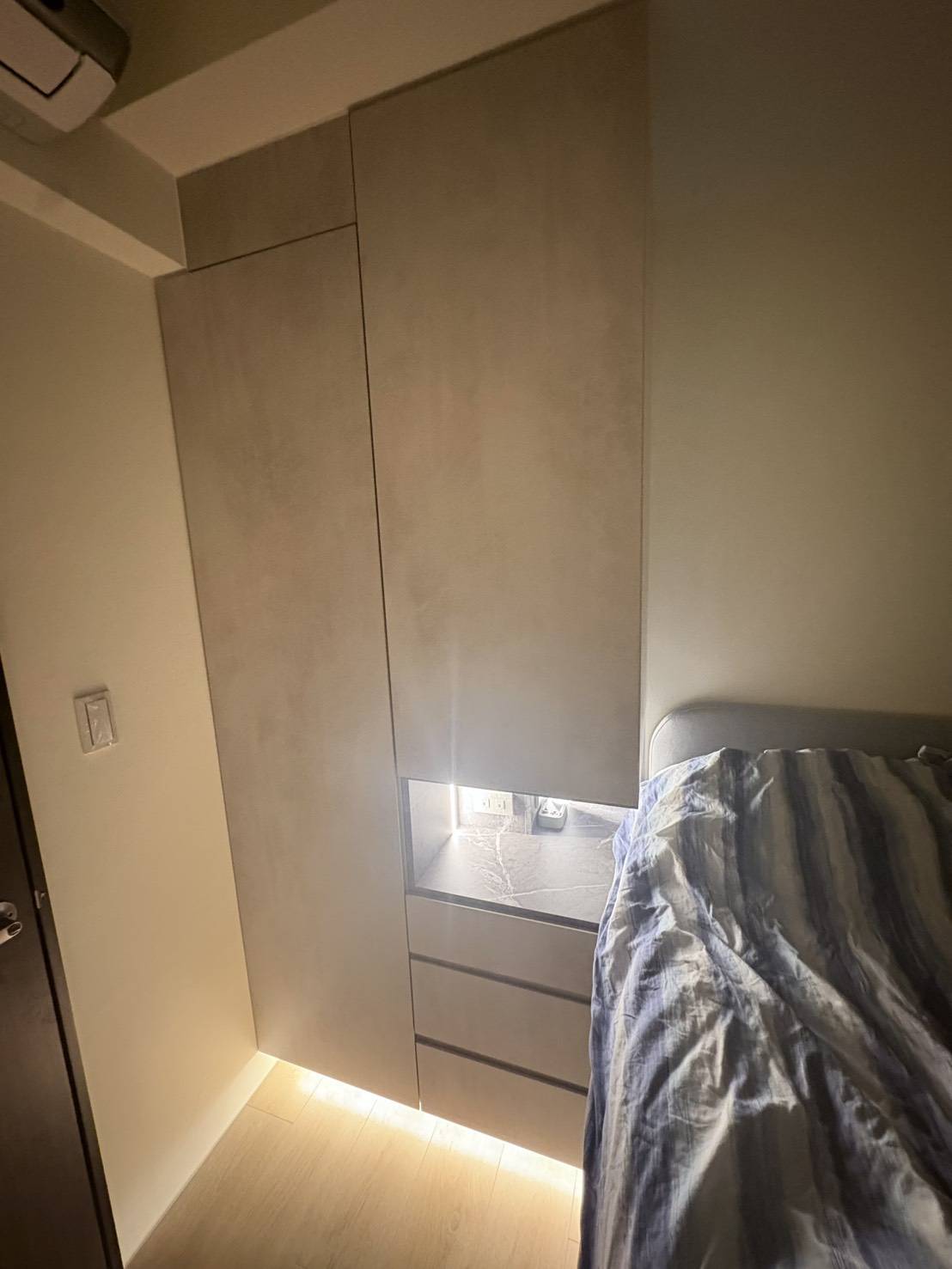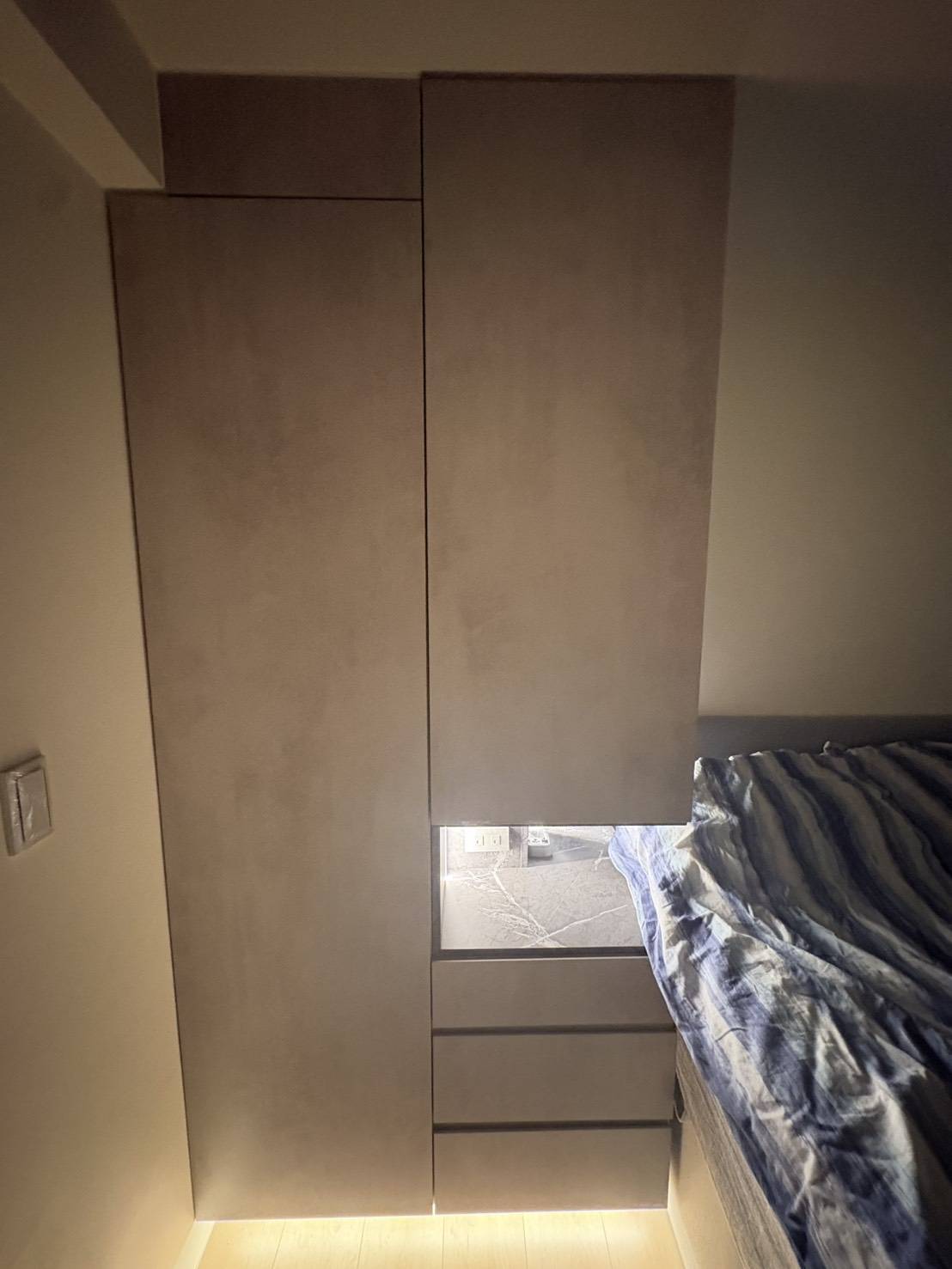 本案以臥室收納需求為主要出發點,透過系統衣櫃與床邊收納的整合配置,讓衣物、日常用品與睡眠空間之間取得良好平衡,櫃體配置依照實際使用動線規劃,使起居與收納不互相干擾,提升臥室整體的使用便利性。